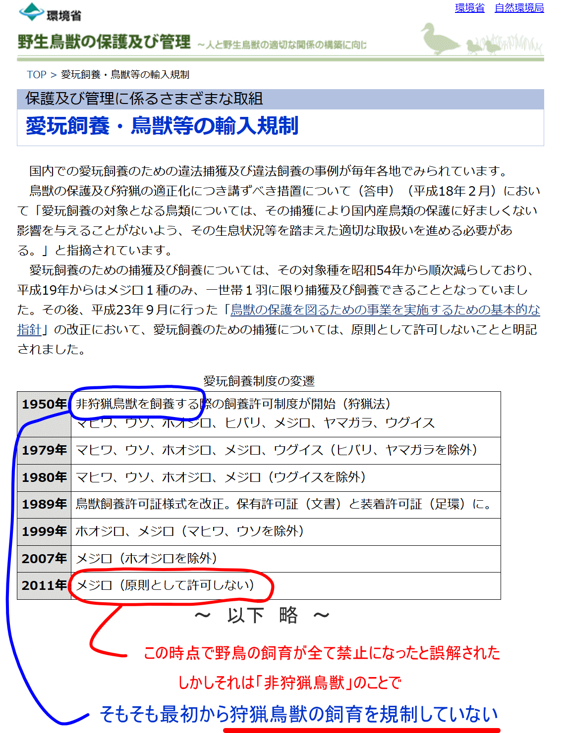 実際にHPを読むと、全ての野鳥の飼育が禁止になったように感じるかもしれないが、よく見てほしい。最初の行に「非狩猟鳥獣を飼養する際の…」と書いてある。つまり狩猟鳥獣の飼育には最初から何の制限も無いということだ。