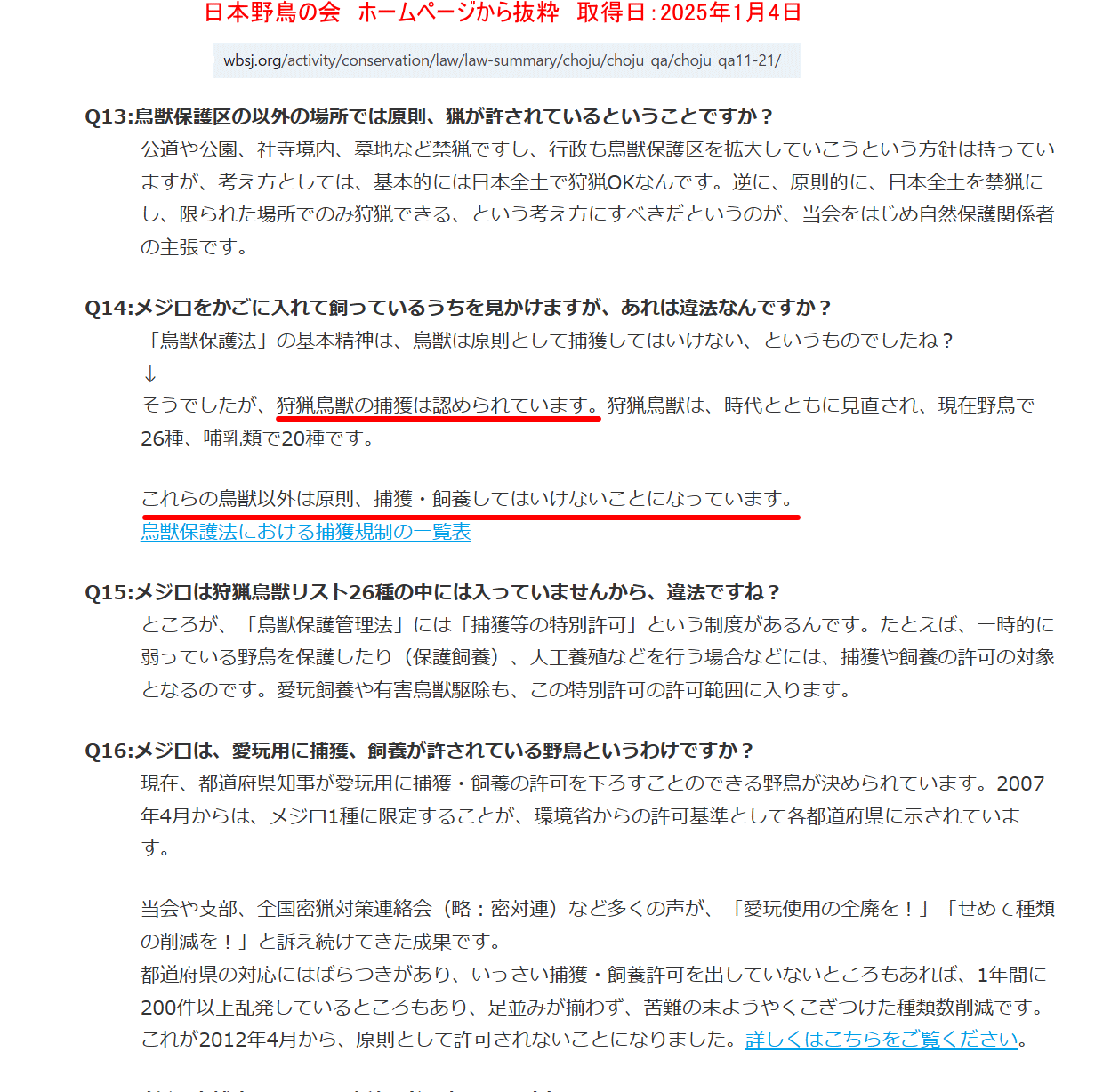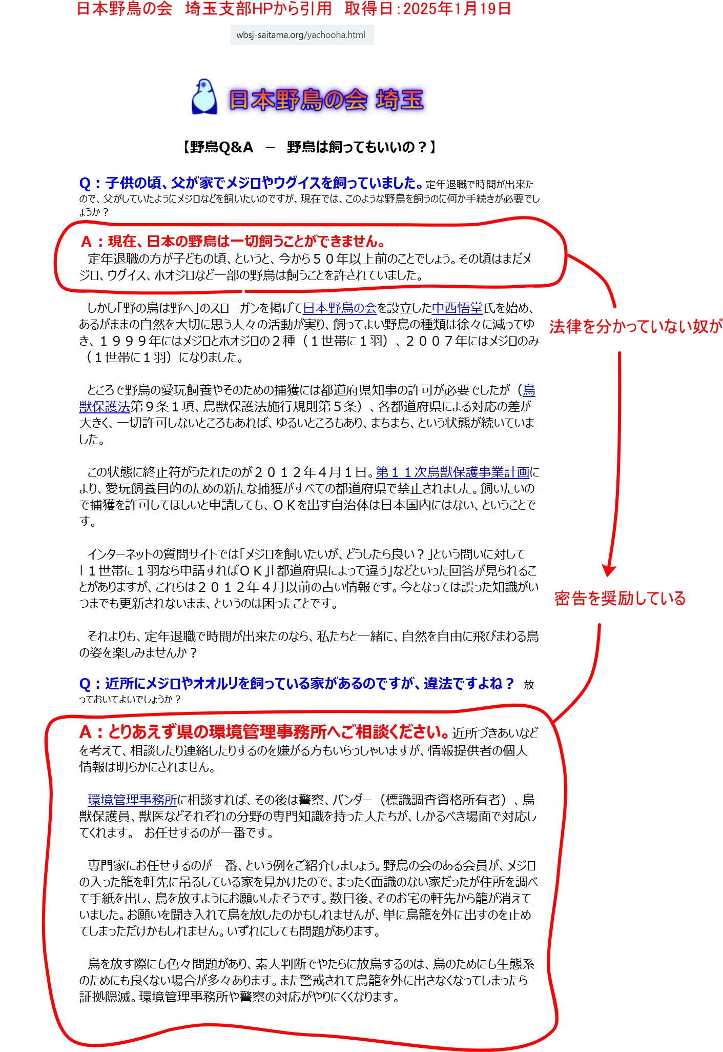 このページを見てのとおり、法改正のたびに野鳥(非狩猟鳥獣)の飼育が厳しくなっている。この原因は日本野鳥の会による執拗なロビー活動の成果だが、もちろん日本野鳥の会の上層部は法律をよく知っている。彼らのホームページにもハッキリとこのように記載があるのだ。