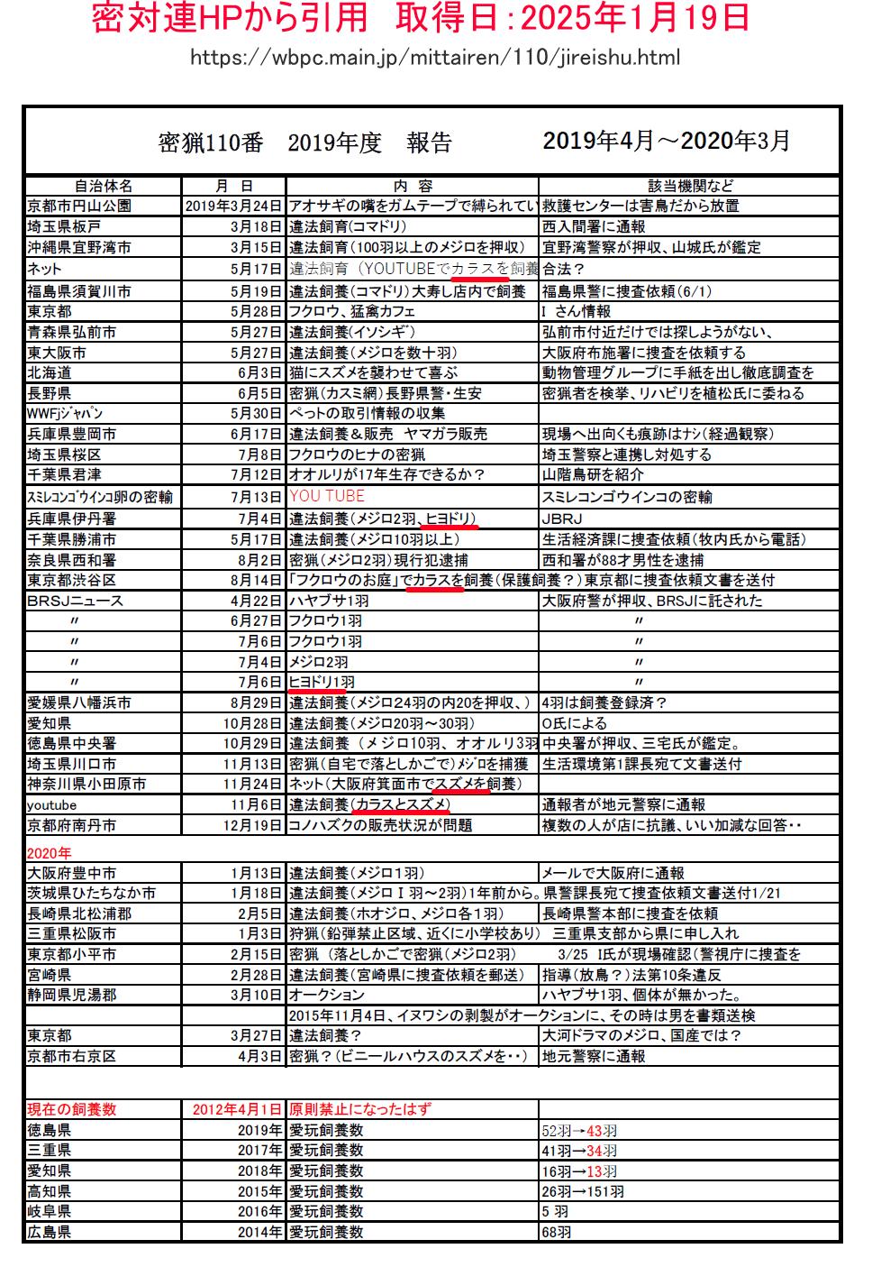 これは2019年度の密告リストだ。彼らが守るべきメジロ等の他に、カラスやスズメ、ヒヨドリなどの狩猟鳥獣もゴチャ混ぜで通報し、押収された事例もあるようだ。この年だけで違法飼育の誤認が6件もあることに絶句する。その他、笑ってはいけないが、カラス系ユーチューバーも密告されている(笑)。このように、法的知識の欠片も無い連中が違法飼育の密告を煽り、市民を相互監視させるようなことをしているのだ。こういう連中が環境省に働きかけ、法律の改変を目論んでいることは非常に恐ろしく、笑い事ではない。